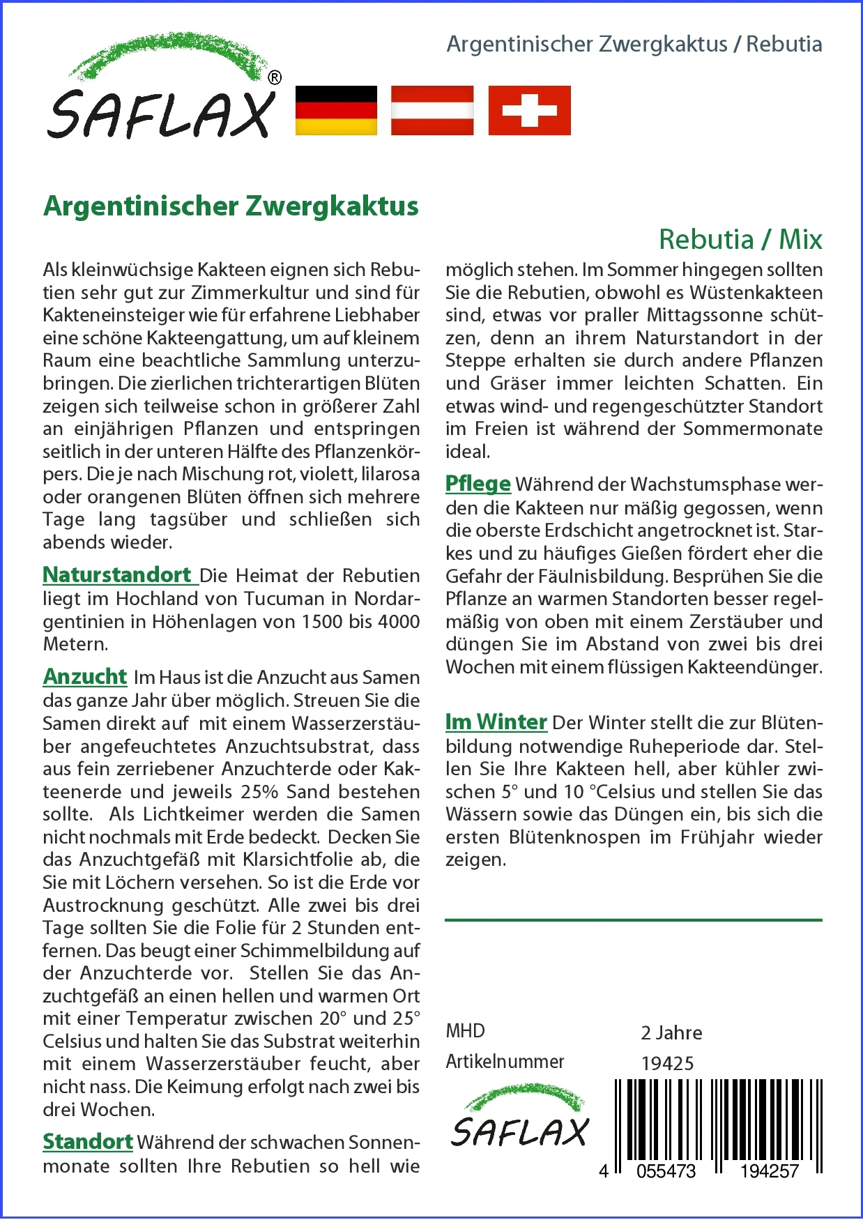 Als kleinwüchsige Kakteen eignen sich Rebutien sehr gut zur Zimmerkultur und sind für Kakteneinsteiger wie für erfahrene Liebhaber eine schöne Kakteengattung, um auf kleinem Raum eine beachtliche Sammlung unterzubringen. Die zierlichen trichterartigen Blüten zeigen sich teilweise schon in größerer Zahl an einjährigen Pflanzen und entspringen seitlich in der unteren Hälfte des Pflanzenkörpers. Die je nach Mischung rot, violett, lilarosa oder orangenen Blüten öffnen sich mehrere Tage lang tagsüber und schließen sich abends wieder.