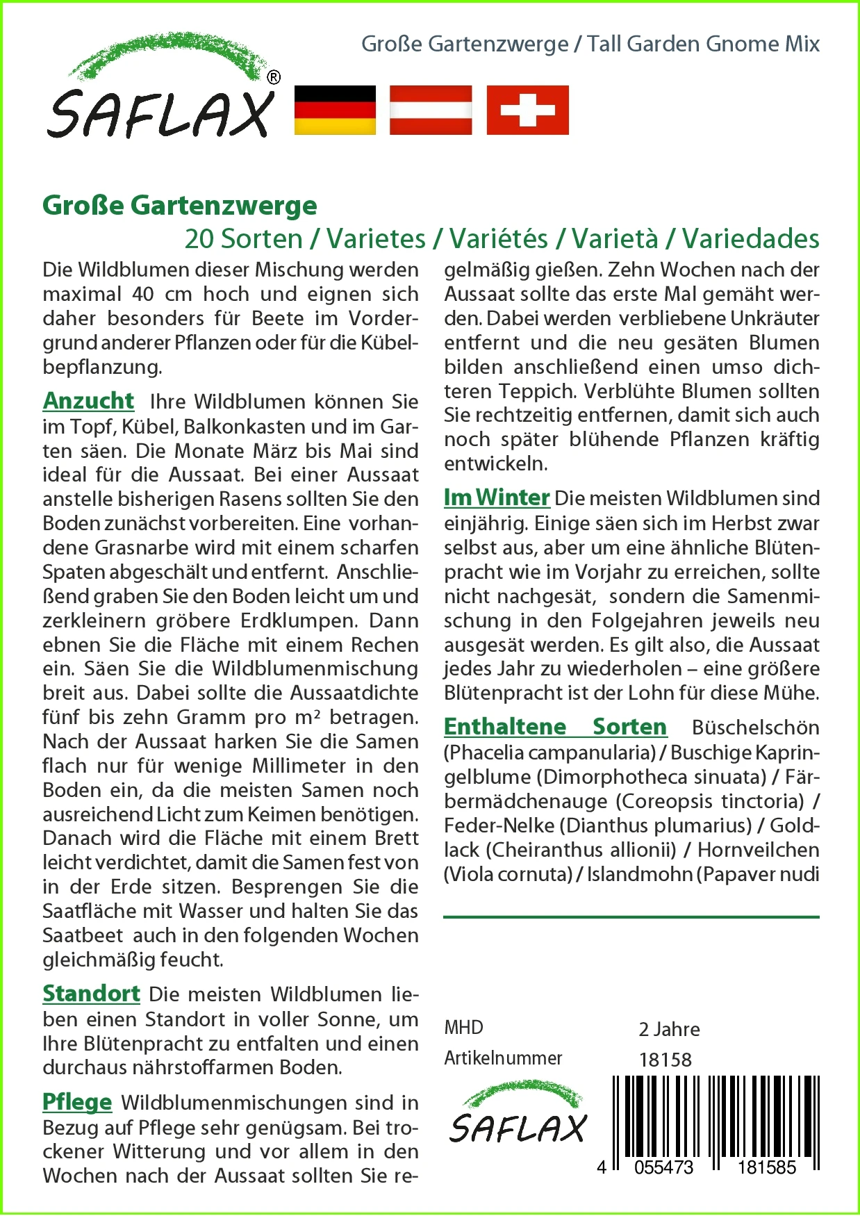 Die Wildblumen dieser Mischung werden maximal 40 cm hoch und eignen sich daher besonders für Beete im Vordergrund anderer Pflanzen oder für die Kübelbepflanzung.
