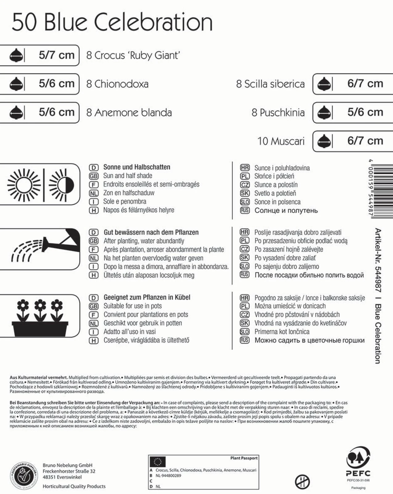 Mit der Colour Symphony „Blue Celebration“ kommen Sie über einen langen Zeitraum in den Genuss eines blauen Blütentraums, denn die verschiedenen Arten erblühen nach und nach von Februar bis Mai. Die Mischung besteht zum Beispiel aus Anemonen, Sternhyazinthen, Krokussen, Traubenhyazinthen und Blausternen, welche Wuchshöhen zwischen 10 und 25 cm erreichen. Damit sind die mehrjährigen, winterharten Pflanzen auch für die Kultur in Hochbeeten, Kübeln und Kästen gut geeignet. Aufgrund der vielen nektarreichen Blüten ist die Mischung nicht zuletzt für Insekten wie Bienen und Hummeln eine gern besuchte Nahrungsquelle.
