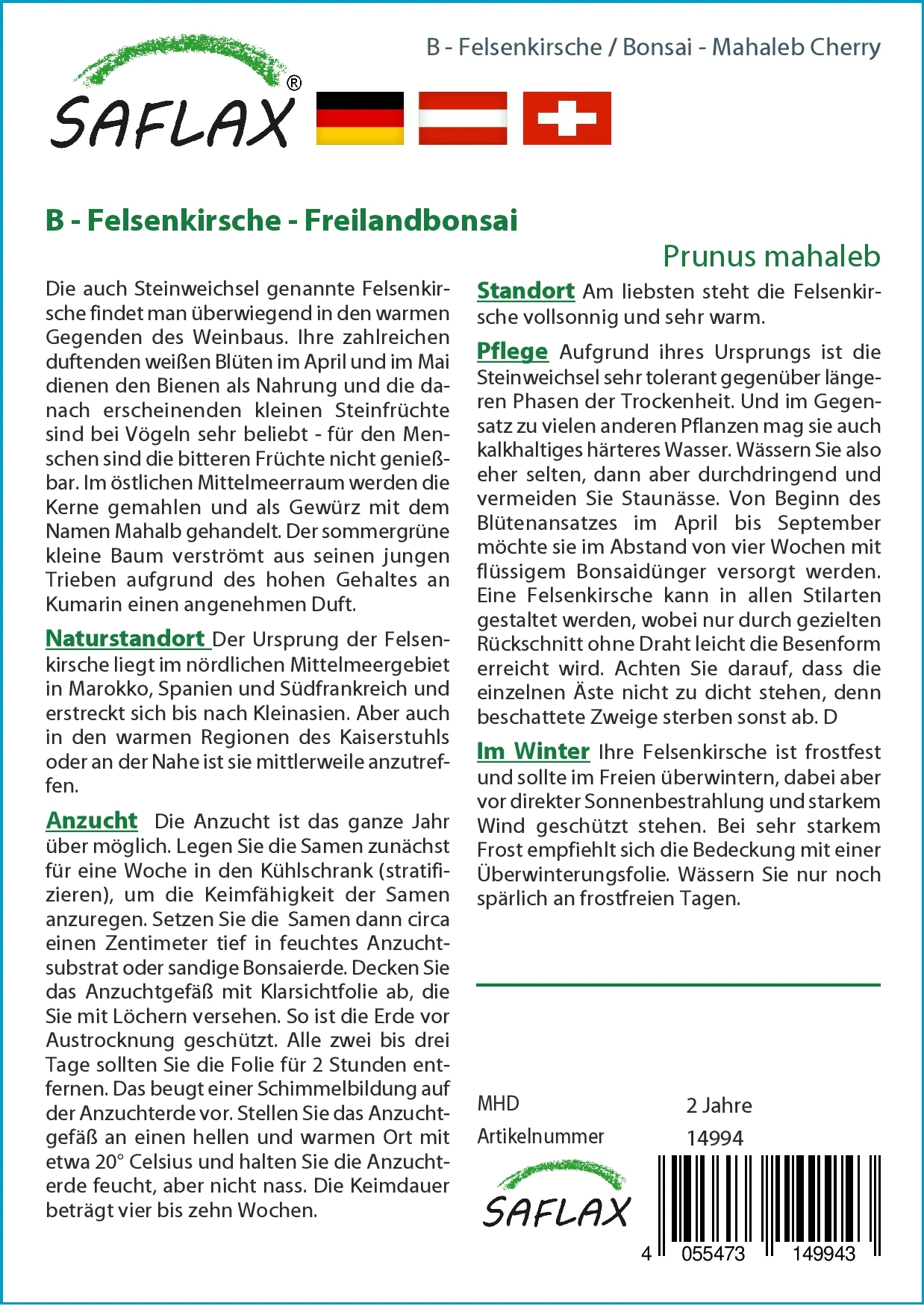 Aufgrund ihres Ursprungs ist die Steinweichsel sehr tolerant gegenüber längeren Phasen der Trockenheit. Und im Gegensatz zu vielen anderen Pflanzen mag sie auch kalkhaltiges härteres Wasser. Wässern Sie also eher selten, dann aber durchdringend und vermeiden Sie Staunässe. Von Beginn des Blütenansatzes im April bis September möchte sie im Abstand von vier Wochen mit flüssigem Bonsaidünger versorgt werden.