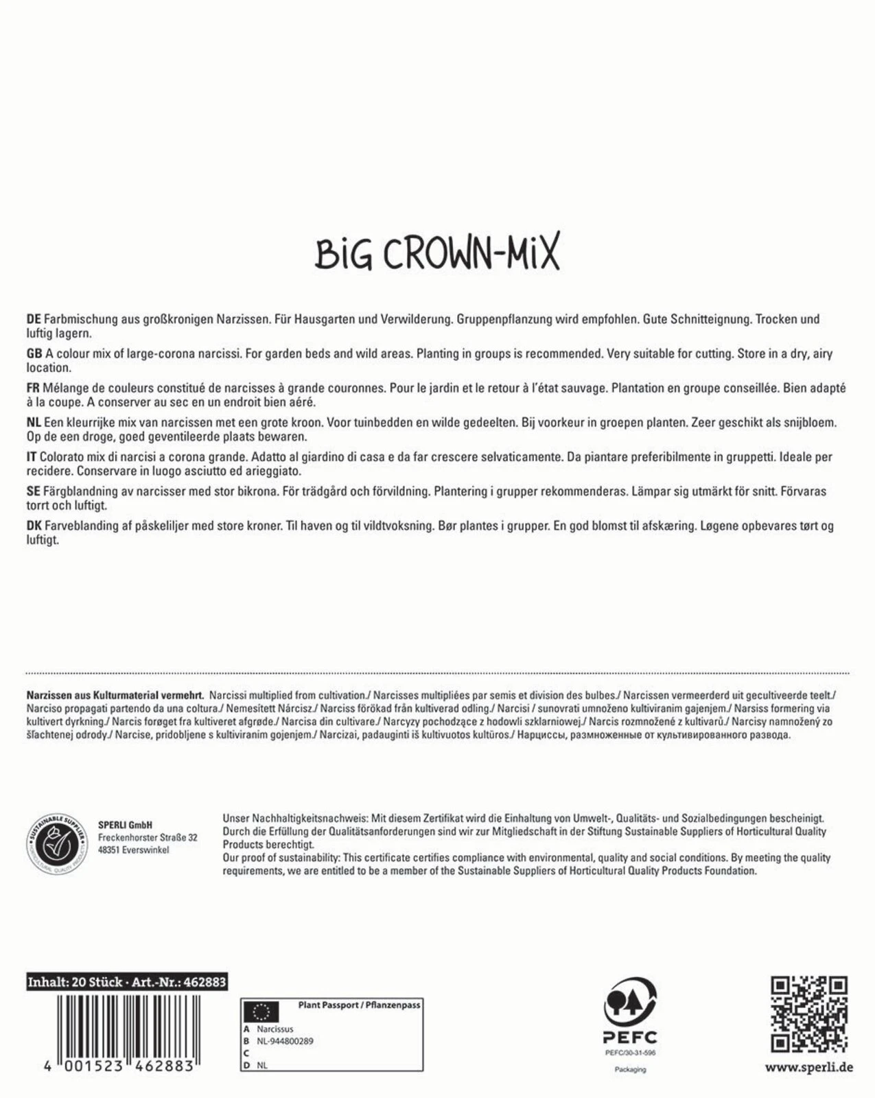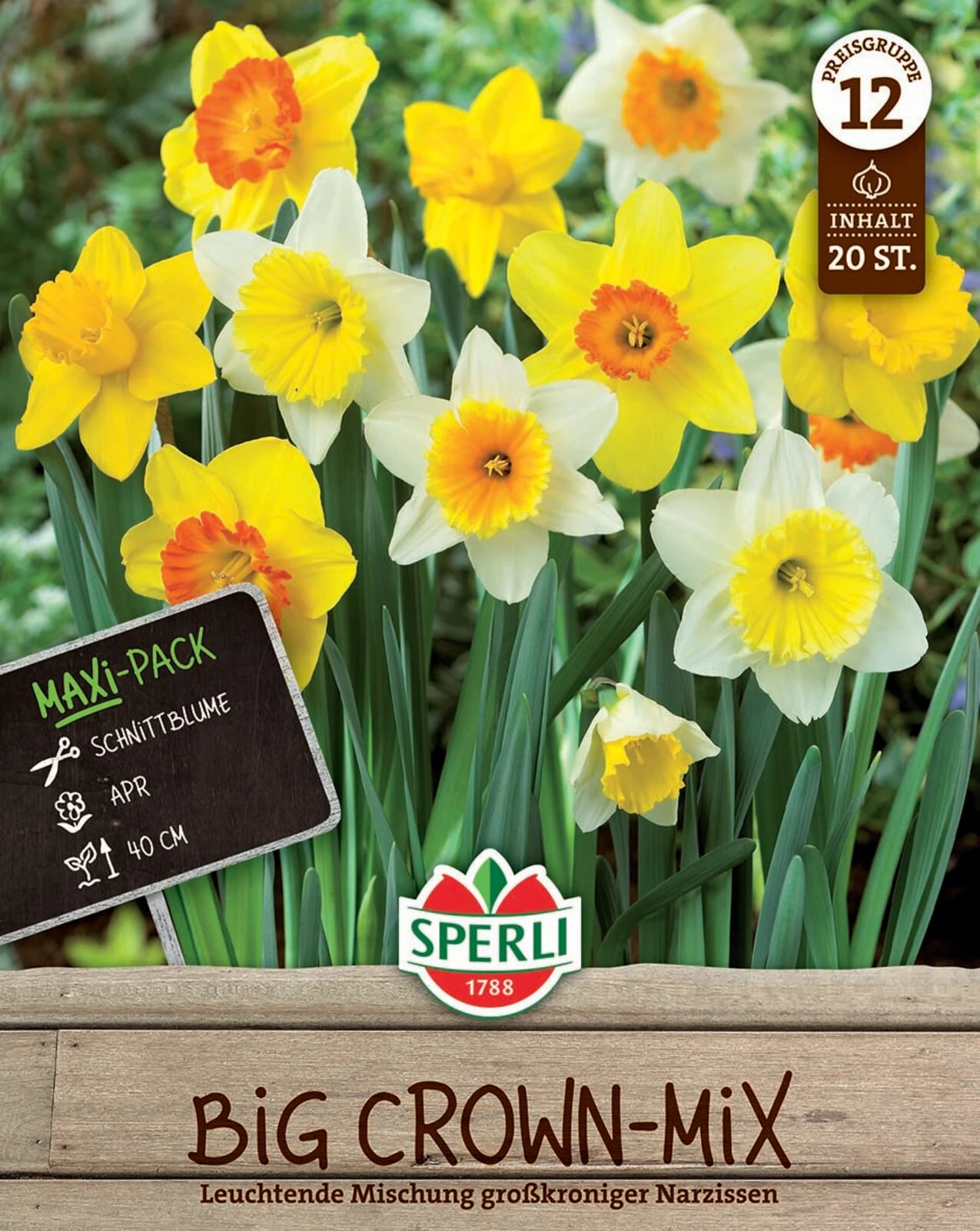 Farbmischung aus großkronigen Narzissen. Für Kübel, Kästen, Hausgarten und Verwilderung. Gruppenpflanzung wird empfohlen. Gute Schnitteignung.Trocken und luftig lagern.