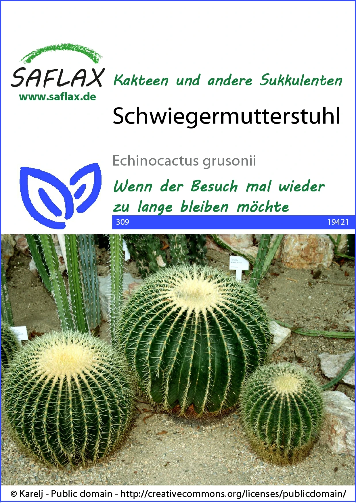 Der kugelige Kaktus kann in seiner Heimat einen Durchmesser von 80 Zentimetern erreichen und hätte damit durchaus Stuhlgröße, wenn er nicht mit harten Dornen bewehrt wäre, die ihn so geeignet für (un)geliebte Schwiegermütter macht. Seine Rippen ermöglichen dem Kaktus eine hohe Wasseraufnahme, denn sie dehnen sich bei Feuchtigkeitsaufnahme aus und ziehen sich bei zunehmender Austrocknung allmählich wieder zusammen. Da dieses hohe Wasserspeicherungspotential in der Wüste durchaus Begehrlichkeiten weckt, schützt er sich mit seinen dichten, gelblichen, leicht bogenförmigen und circa 5 cm langen Dornen. Das Zentrum der Kugel, die Wachstumszone ist von einem Haarfilz bedeckt, der vor Sonnenbrand schützt. Dort bilden sich bei älteren Pflanzen auch die kleinen gelben Blüten, wenn der Kaktus mehr als 30 Zentimeter Durchmesser erreicht hat.