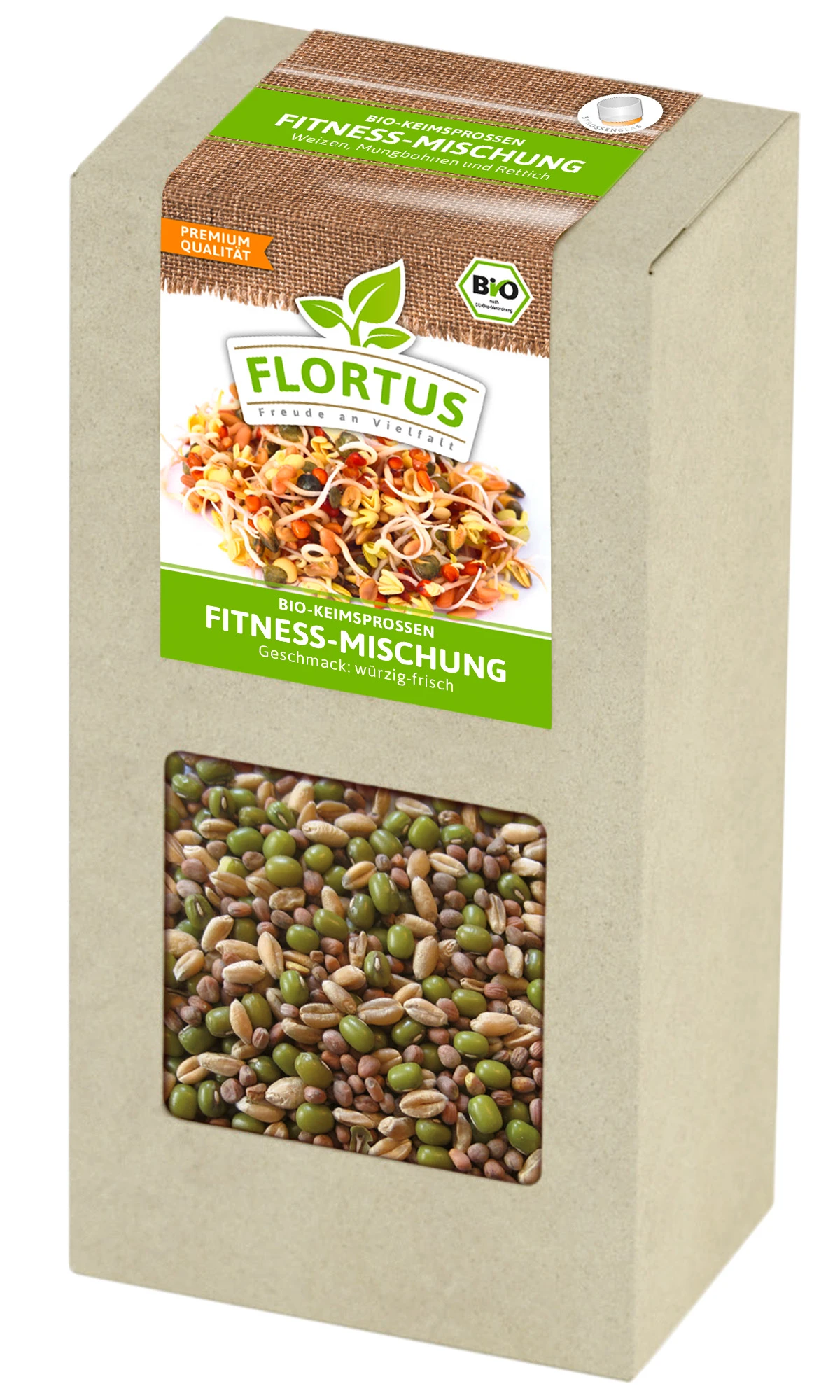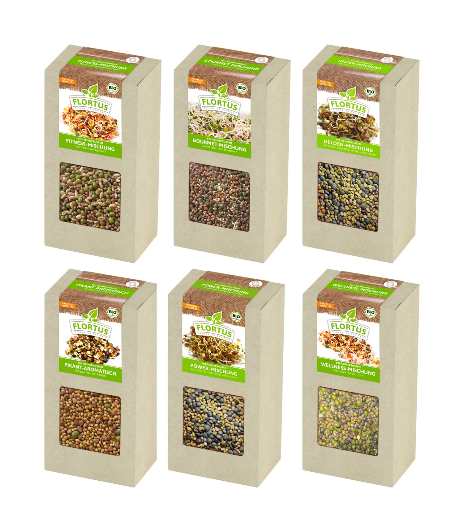 Sechs Mischungen – sechs mal gesunde Sprossen in einer Mischung. Jede Keimsprossen-Mischung ist perfekt abgestimmt. Ob Fitness-Mischung, Gourmet-Mischung, Wellness-Mischung oder eine der anderen Kreationen – jede hat ihren geschmacklichen Reiz. Die FLORTUS Sprossenmischungen werden einfach in Sprossengläsern oder anderen Anzuchtgeräten auf der Fensterbank herangezogen. Gerade in der Winterzeit sind die Sprossen Mischungen eine willkommene Abwechslung auf dem Tisch. Obendrein sind die Sprossen sehr vitaminreich.