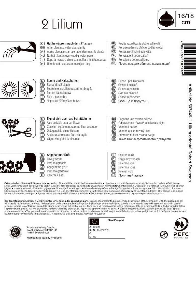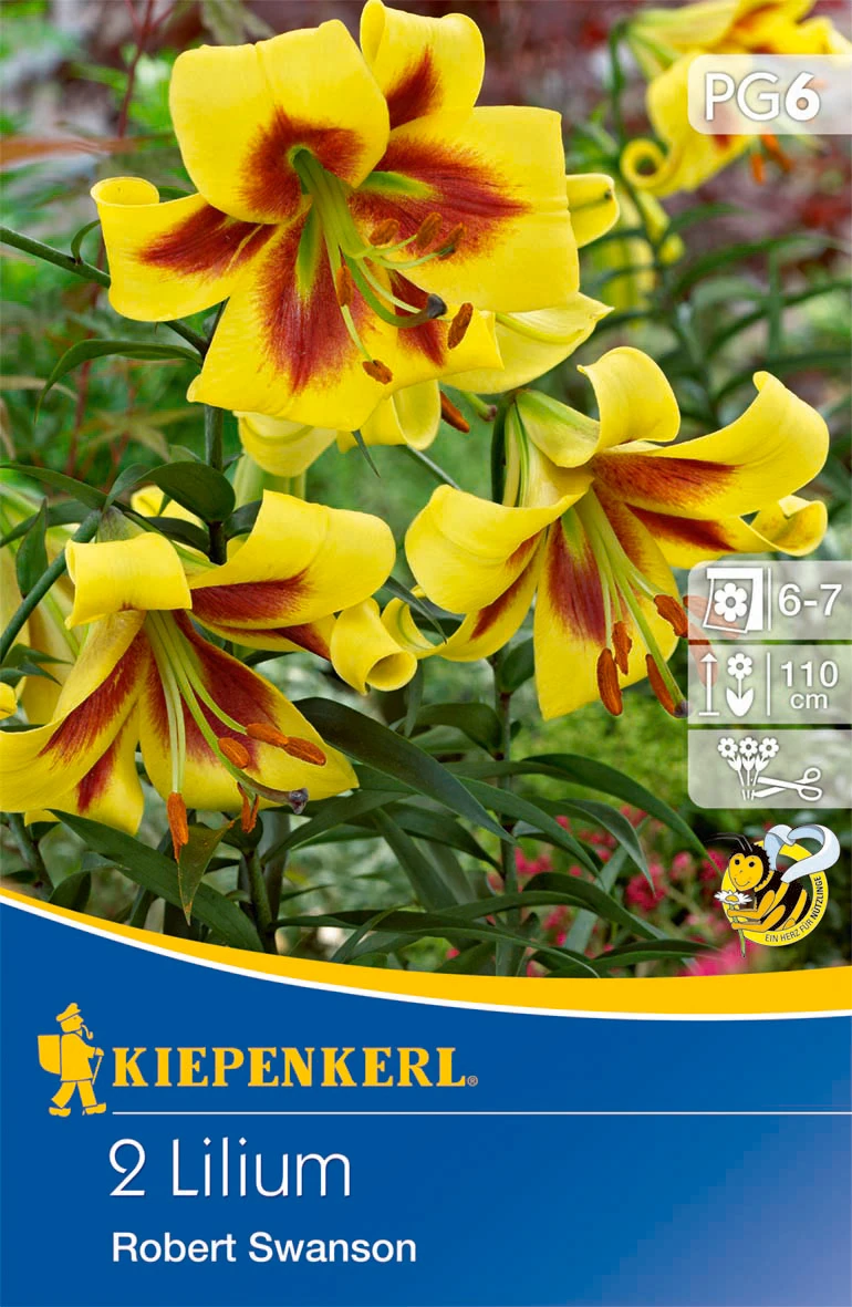 Die Blüten der Lilie ‚Robert Swanson‘ haben eine auffällige Trompetenform. Sie sind sehr groß und wirken dadurch besonders edel. Hinzu kommt die bronzerote und gelbe Farbgebung, sodass die ‚Robert Swanson‘ wirklich ein Blickfang in jedem Garten und jeder Vase ist, denn diese Lilie kann auch hervorragend für Blumensträuße verwendet werden. Von Juni bis Juli blüht die hübsche Blume an einem sonnigen bis halbschattigen Standort. Sie wird etwa 110 cm hoch und zieht Nützlinge an.