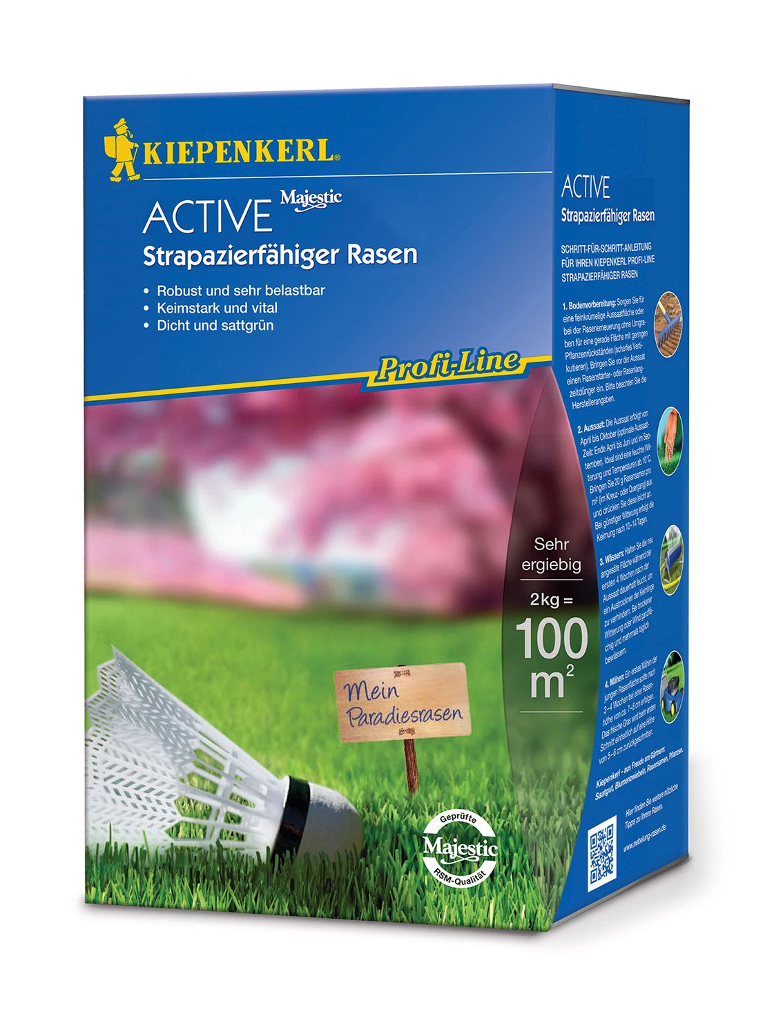 ProfiLine Active. Robust und sehr belastbar. Keimstark und vital. Dicht und sattgrün. Geringe Aufwandmenge: nur 20 g/ m². Reicht für ca. 100 m².