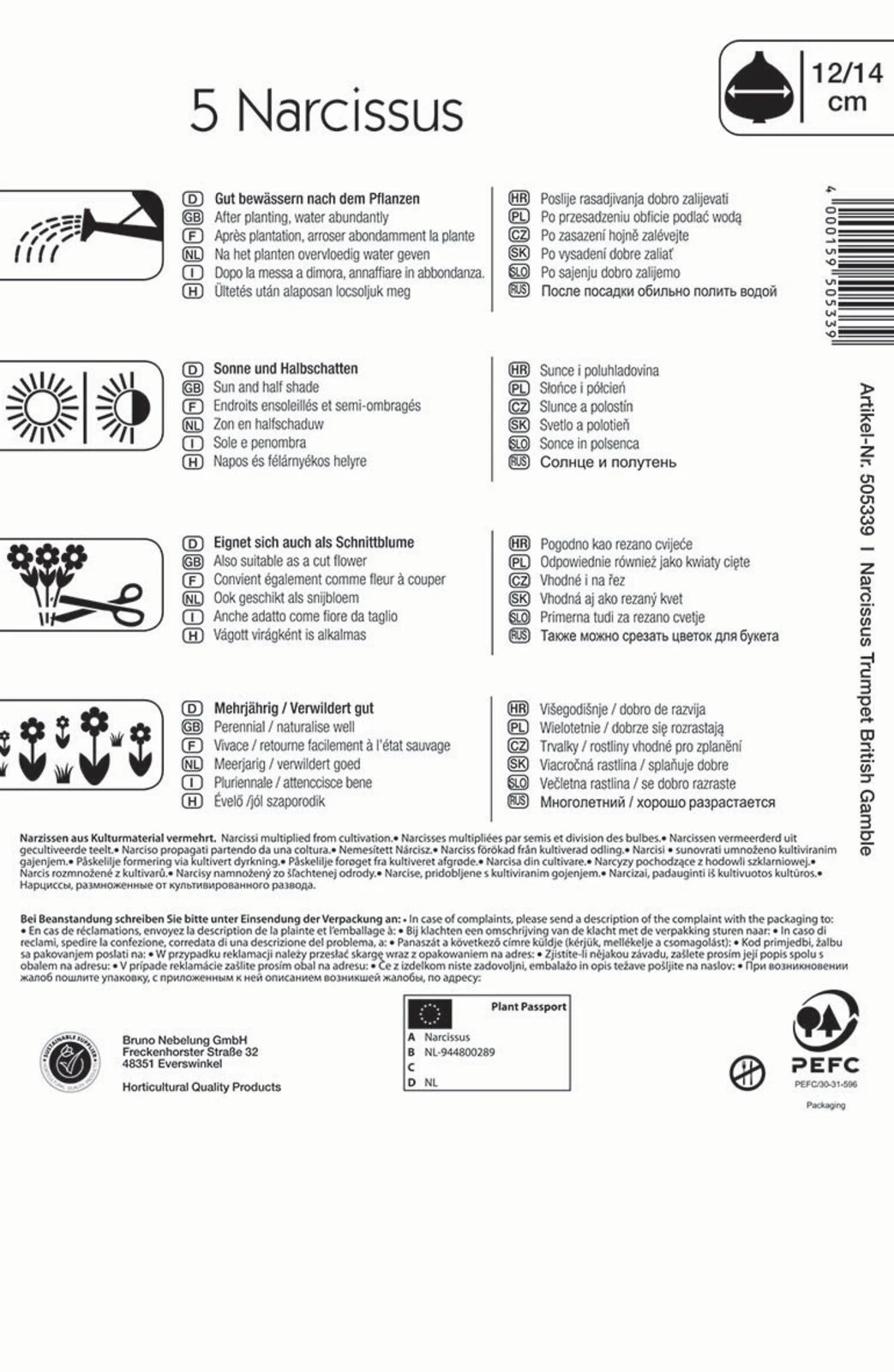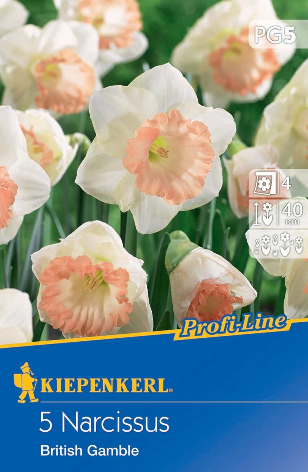 Elegant und zurückhaltend präsentiert sich die Profi-Line-Narzisse ‚British Gamble‘. Ihre Blütenkrone ist zart weiß und umrahmt eine Nebenkrone in Apricot. An ungestörten Stellen vermehren sich diese winterharten Narzissen gut durch Tochterzwiebeln. Sie blüht im April und ist mehrjährig. Die Blütenstiele werden bis zu 40 cm lang und sind nicht nur im Beet, sondern auch in der Vase eine tolle Dekoration.
