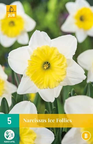Kräftige Narzisse mit großem Kelch, cremeweißer Blüte und gelbem Kelch, der sich im Laufe der Blüte fast weiß verfärbt. Es ist eine sehr geeignete Narzisse zum Einbürgern. Ice Follies sind schön im Beet, aber auch in Töpfen auf der Terrasse oder dem Balkon. Schön mit Hyazinthen zu kombinieren.