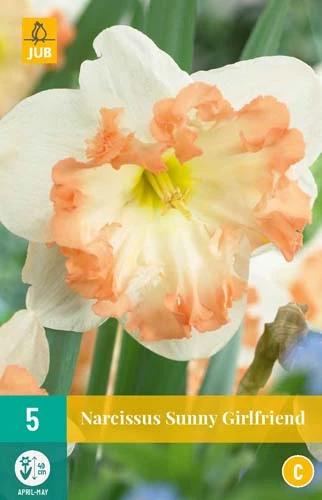 Split-crowned (Butterfly) Daffodil Sunny Girlfriend hat weiße Blütenblätter, die von einer blassgelben, geteilten Krone überlappt werden, die sich in ein helles Orange öffnet. Manchmal mehrere Blüten pro Stiel. Sunny Girlfriend hat einen wunderbaren Duft und verdient einen schönen Platz in Ihrem Beet oder in einem Topf auf der Terrasse oder dem Balkon.