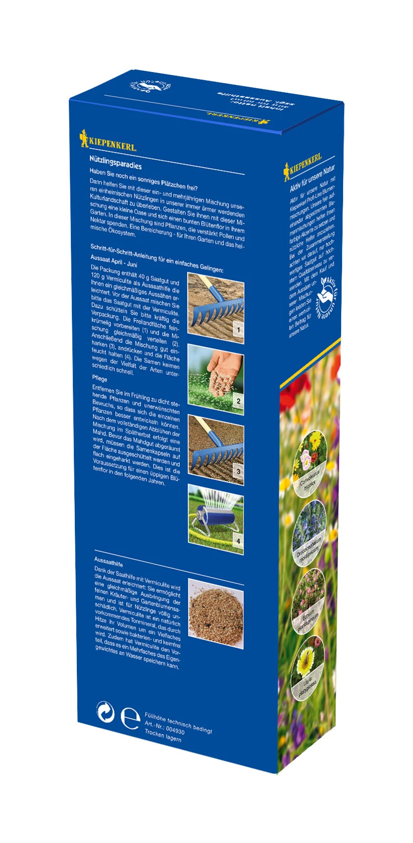 Blütenparadies mit reichlich Nektar als Nahrungsgrundlage für Hummeln, Bienen und Falter. Haben Sie noch ein sonniges Plätzchen frei? Dann helfen Sie mit dieser ein- und mehrjährigen Mischung unseren einheimischen Nützlingen in unserer immer ärmer werdenden Kulturlandschaft zu überleben. Gestalten Sie ihnen mit dieser Mischung eine kleine Oase und sich einen bunten Blütenflor in Ihrem Garten. In dieser Mischung sind Pflanzen, die verstärkt Pollen und Nektar spenden. Eine Bereicherungfür Ihren Garten und das heimische Ökosystem. Unsere speziellen und vielseitigen Blumenmischungen bestehen aus 40 g hochwertigem Blumensaatgut und 100 g Aussaathilfe.