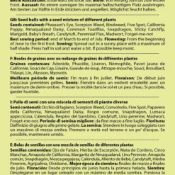 Samenbälle mit einer Saatmischung verschiedener Pflanzen Beste Aussaatzeit: Ende März bis Ende Juli. Blüte: Von Anfang Juni bis zum ersten Frost. Aussaat: An einem sonnigen bis maximal halbschattigen Platz ausbringen. Am besten zur Hälfte in Erde drücken und angießen. Möglichst feucht halten.