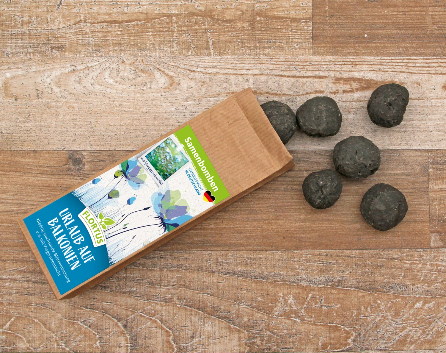 Wir möchten, dass die Pflanzenwelt in den Städten bunter wird. Das Einheitsgrün vielerorts bedeutet für Bienen, Hummeln und Schmetterlinge ökologisches Ödland. Dabei ist es leicht, eine reiche Artenvielfalt zu schaffen. Die FLORTUS Samenbomben können dazu beitragen! Für Garten oder Balkon, als Gastgeschenk oder Giveaway. Mit ‚Urlaub auf Balkonien‘ wachsen im Sommer Blümchen in Kübeln, Kästen und Töpfen, die nicht größer als 40 cm werden.
