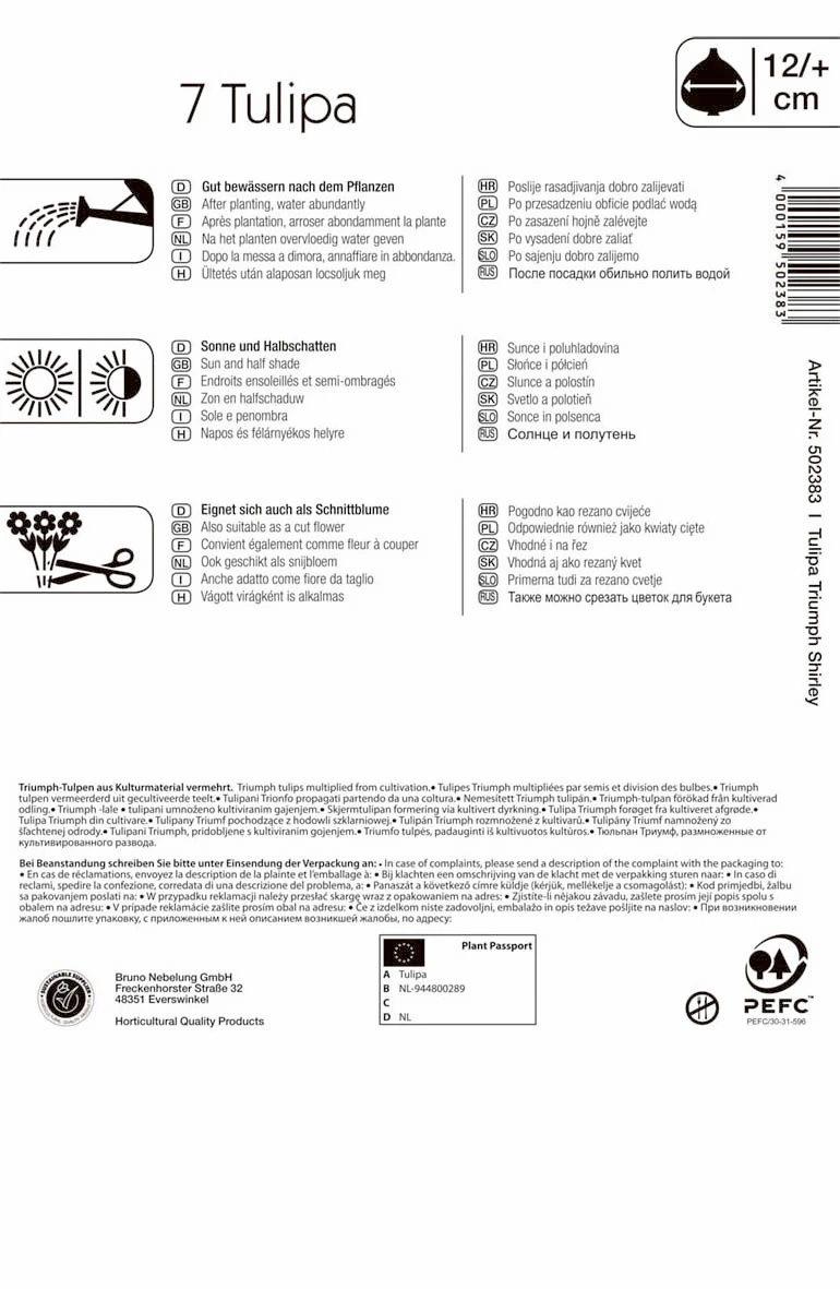 ‚Shirley‘ ist eine Triumph-Tulpe mit besonderer Färbung. Die elfenbeinfarbigen Blütenblätter sind mit einem schmalen, purpurnen Rand dekoriert und sehen aus wie gemalt. Diese Tulpensorte wird klassisch im Gartenbeet herangezogen und erreicht eine Höhe von rund 55 cm. Im Mai schmückt sie sich mit ihren anmutigen Blüten. ‚Shirley‘ ist sehr gut für den Schnitt geeignet.
