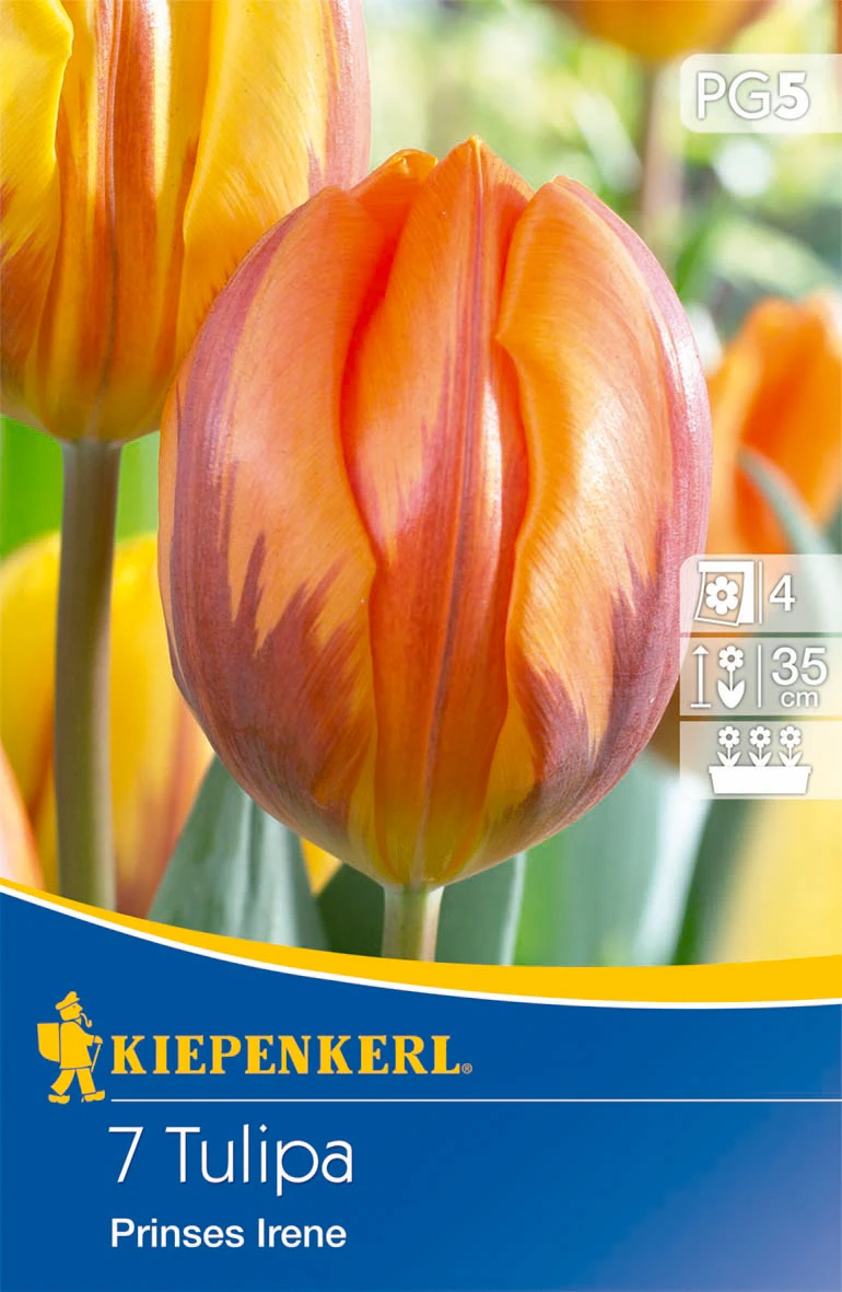 Mit ihren orangefarbenen Blüten mit feiner Zeichnung hat die Triumphtulpe ‚Prinses Irene‘ schon viele Gartenfreunde von sich überzeugt. Die im April blühende Tulpe macht mit ihrer Färbung Lust auf den Frühling und sonnige Tage im Garten. Dank ihrer sehr guten Schnitteignung, können Sie sich dieses Gefühl auch in der Wohnung bewahren. In der Vase ist ‚Prinses Irene‘ sehr haltbar.